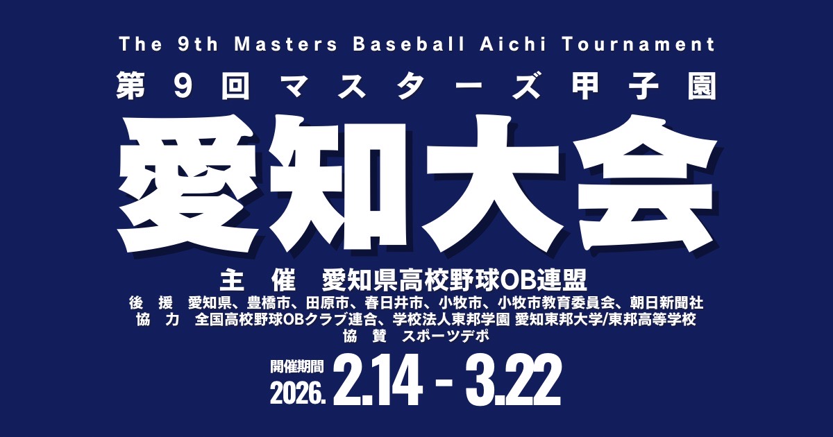 大会概要 主催 愛知県高校野球OB連盟 会期 令和7年2月16日(日)~6月1日(日) 会場 刈谷球場 春日井市民球場 渥美運動公園野球場 大府市民球場 豊橋市民球場 大会規則 [第8回マスターズ甲子 ...