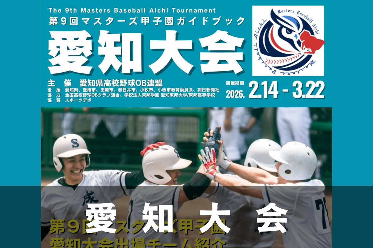 第9回マスターズ甲子園愛知大会は、2026年2月14日より開幕し、3月21日をもって全日程を終了いたしました。 今大会は新規加盟の横須賀高校OBを含む20チームが参加し、各会場にて白熱した試合が繰り広げられました。 選手一人ひとりが高校時代の想いを胸に、全力でプレーする姿は、多くの感動と勇気を与えてくれました。 ■大会成績 優 勝 愛工大名電高校OB 準優勝 杜若高校OB 第3位 国府高校OB 第3位 成章高校OB 優勝された愛工大名電高校OBの皆さま、誠におめでとうございます。 今大会を制した愛工大 ...