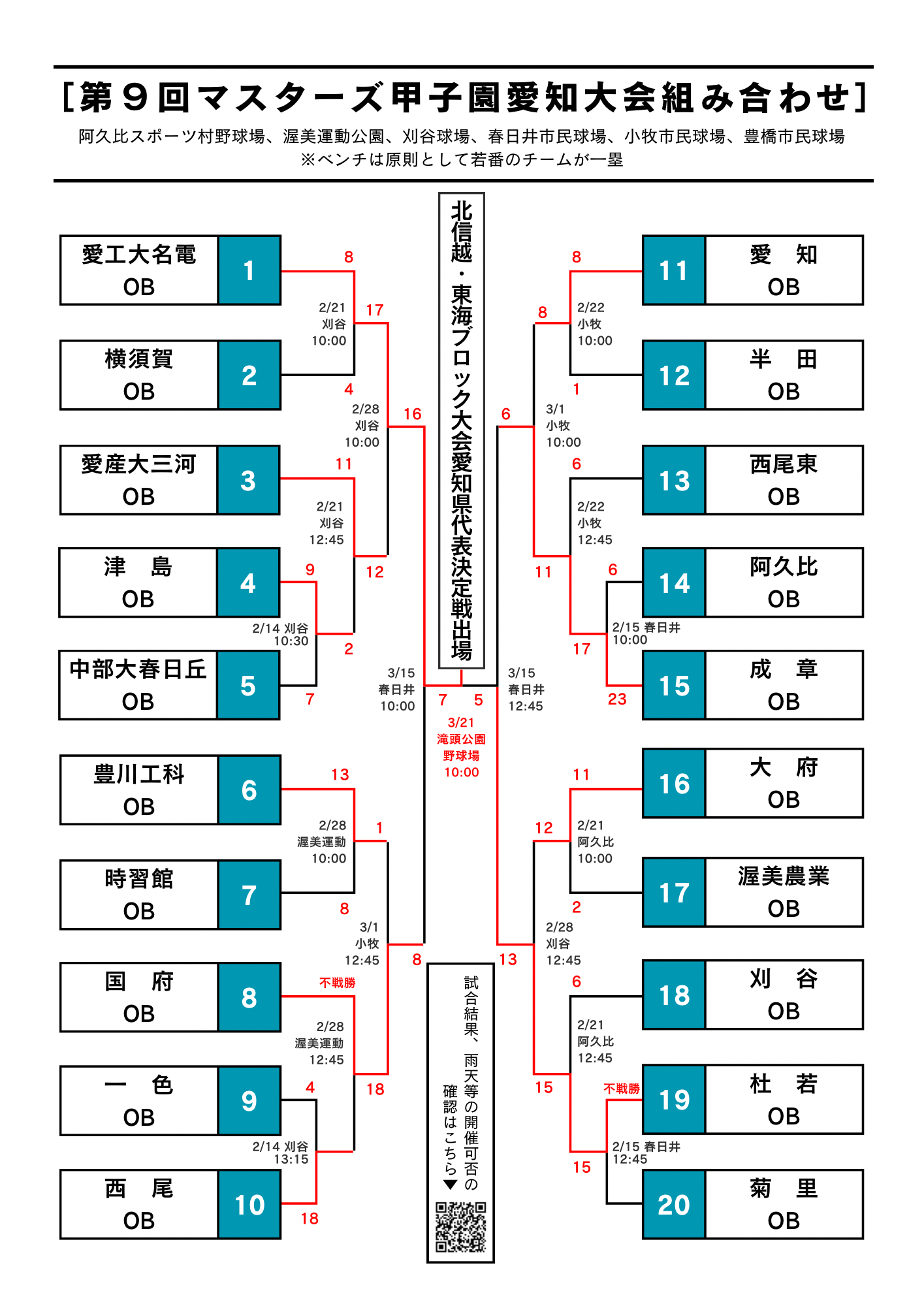 HOME > お知らせ > お知らせ【試合結果】第9回マスターズ甲子園愛知大会大会8日目 2026年3月21日 【試合結果】大会8日目決 勝愛工大名電OB 7-5 杜若OBランニングスコアはこちらからご確認ください