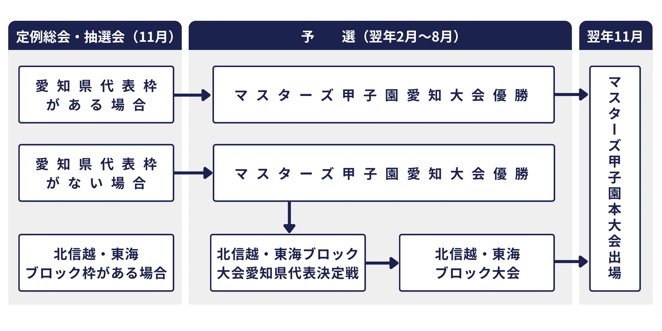 マスターズ甲子園(11月、阪神甲子園球場)へ出場するには、愛知県代表枠、北信越・東海ブロック枠があり、全国高校野球OBクラブ連合の定例総会(11月)において、次年のマスターズ甲子園本大会出場枠が決まります。